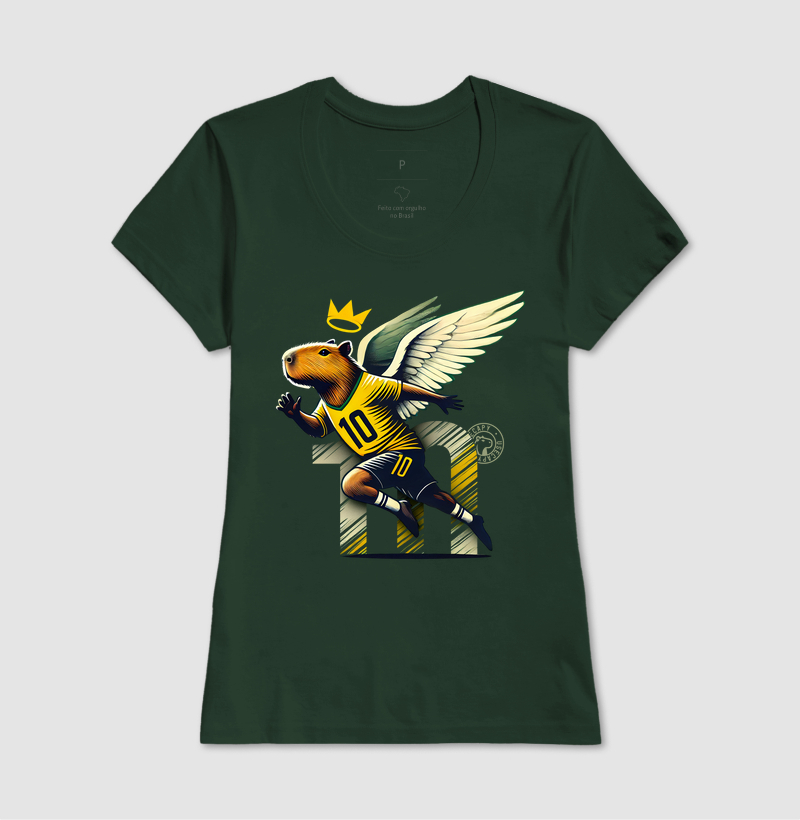 Nossa estampa Camisa 10 é uma homenagem ao eterno craque Pelé, que encantou o mundo com sua habilidade, carisma e legado inigualável no futebol. Nessa estampa, nossa capivara veste a camisa 10 com orgulho, representando a paixão pelo futebol e a saudade que sentimos do Rei. Para quem ama o esporte e admira o ícone Pelé, essa estampa é mais que uma camiseta; é uma reverência à lenda do futebol!